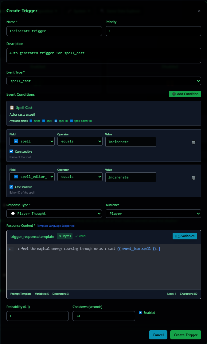 spell_cast) - Conditions: Fields like spell name, editor ID, or actor type that filter the trigger