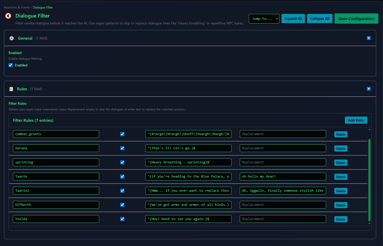 SkyrimNet immediately reloads the updated filters — no restart required.