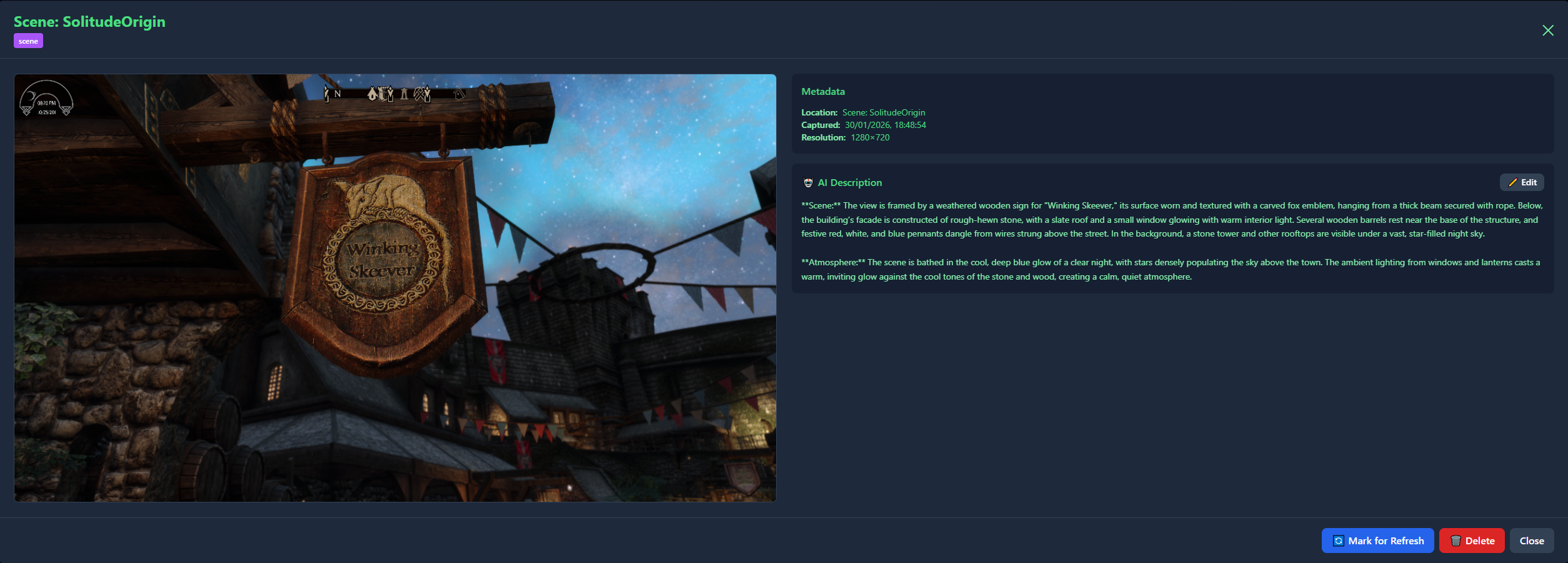 - Captures images during player-initiated dialogue, when entering new areas, or via the background worker.