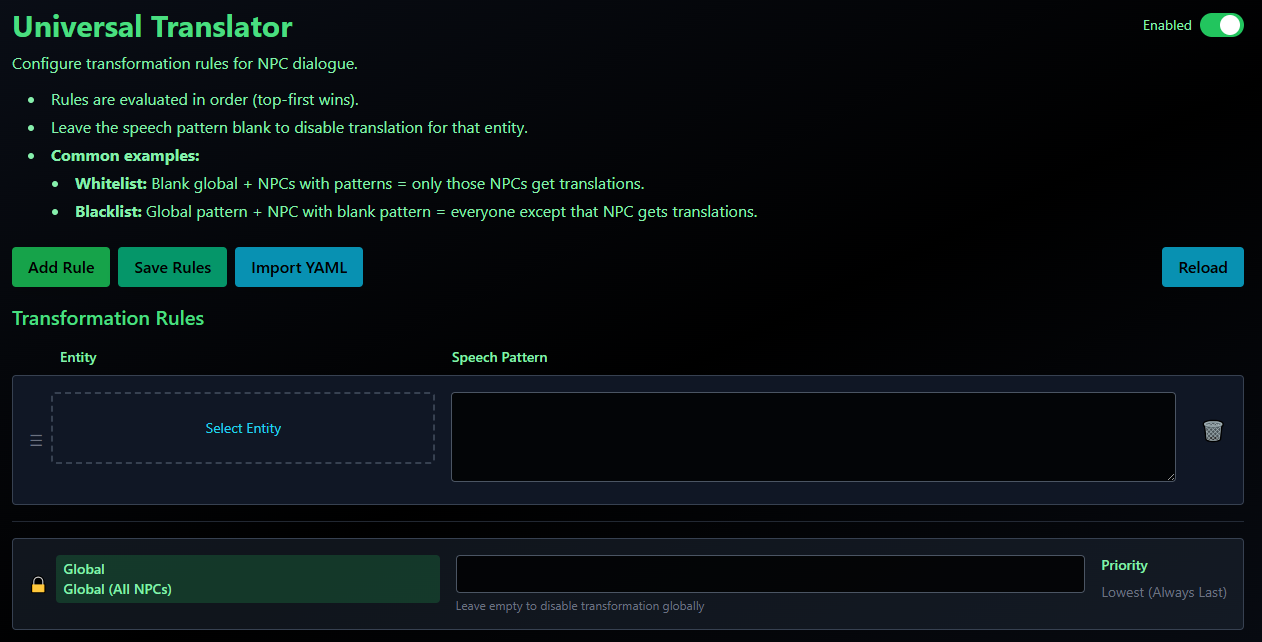 Completely reimagine Skyrim’s dialogue. Universal Translator transforms both vanilla and modded lines using custom speech patterns, along with awareness of each NPC’s bio and recent events.